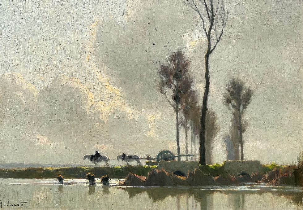 Jacob is best known for his atmospheric and luminous landscapes. He gained his rare understanding and love for nature through studied inspection, transferring his observations skillfully on to canvas. His masterful evocation of light, atmosphere, colour and sense of place are remarkable and have a true ability to transport the viewer to the very banks of the River Seine and River Marne where Jacob would patiently wait, paintbrush poised to capture his unique visions of the French countryside.